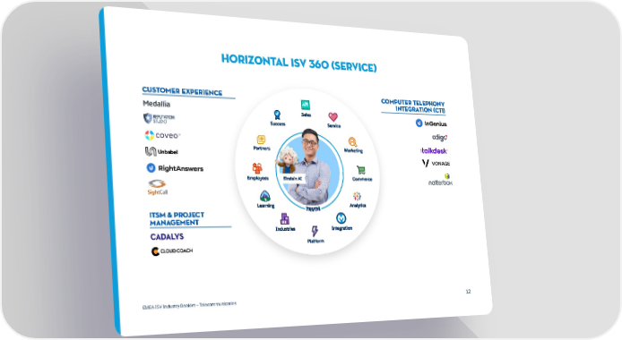 Telecommunication Page 11 Page 13HORIZONTAL ISV 360 (SERVICE) Customer Experience Computer Telephony Integration (CTI) ITSM & Project Management EMEA ISV Industry Booklet — Telecommunication 12