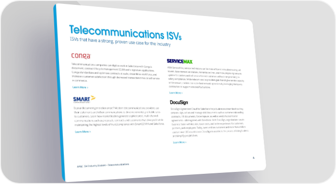 Telecommunications ISVs ISVs that have a strong, proven use case for the industry Telecommunications companies can digitize work in Salesforce with Conga’s With ServiceMax, service technicians can be more efficient in troubleshooting cell document, contract lifecycle management (CLM) and e-signature applications. towers, base transceiver stations, transmission lines, and more, improving network Conga standardizes and optimizes contracts at scale, streamlines workflows, and uptime for carriers and cell service for end customers without compromising on increases customer satisfaction through decreased transaction times or self-service safety compliance. While telecom service providers gain from higher service capacity e-commerce. and revenues, carriers can scale their network operations by leveraging third-party contractors to support seasonal fluctuations. Learn More > Learn More > Is your document generation smart? Modern telecommunications providers use DocuSign Agreement Cloud for Salesforce helps businesses streamline how they their statements and other communications to drive incremental, profitable sales prepare, sign, act on and manage vital documents such as customer onboarding to customers. Learn how market leaders generate sophisticated, multi-channel contracts, HR documents, force majeure, as well as vendor/subcontractor communications such as proposals, contracts and statements that drive profit while agreements - all integrated with Salesforce. With DocuSign, organisations can do maintaining the highest levels of trust/compliance with SmartCOMM and Salesforce. business faster with less risk, lower costs, and better experiences for customers, Learn More > partners, and employees. Today, over a million customers and more than a billion users in over 180 countries use DocuSign to accelerate the process of doing business and simplify people’s lives. Learn More > APAC ISV Industry Booklet — Telecommunications 4