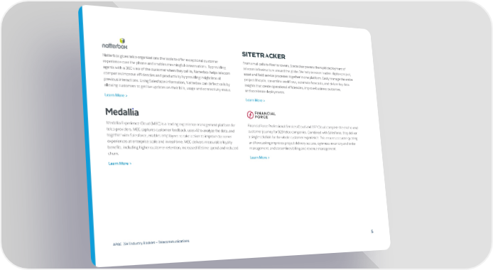 Natterbox gives telco organizations the tools to offer exceptional customer From small cells to fiber to towers, Sitetracker powers the rapid deployment of experience over the phone and enables meaningful conversations. By providing telecom infrastructure around the globe. We help telecom leaders digitize project, agents with a 360 view of the customer when they call in, Natterbox helps telecom asset and field service processes together in one platform. Easily manage the entire companies improve efficiencies and productivity by providing insight into all project lifecycle, streamline workflows, automate forecasts, and deliver key data previous interactions. Using Salesforce information, Natterbox can deflect calls by insights that create operational efficiencies, improve business outcomes, allowing customers to get live updates on their bills, usage and connectivity status. and accelerate deployments. Learn More > Learn More > Medallia Experience Cloud (MEC) is a leading experience management platform for FinancialForce Professional Services Cloud and ERP Cloud complete the end-to-end telco providers. MEC captures customer feedback, uses AI to analyze the data, and customer journey for B2B telco companies. Combined with Salesforce, they deliver together with Salesforce, enables employees to take action to improve customer a single solution for the whole customer experience. This ensures accurate quoting experiences at enterprise scale and in real time. MEC delivers measurable loyalty and forecasting improves project delivery success, optimizes inventory and order benefits, including higher customer retention, increased lifetime spend and reduced management, and streamlines billing and revenue management. churn. Learn More > Learn More > APAC ISV Industry Booklet — Telecommunications 5