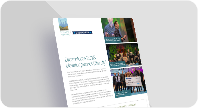 WHAT’S appening CarServ founder Mars Mundy makes his pitch to the judges. Dreamforce 2018 elevator pitches (literally) will.i.am, Emily Chang, and Andre Iguodala quiz a start-up. Most “elevator pitches” happen in a hallway, or a lobby, or — heavens — in a bathroom. But what about an elevator pitch in an actual elevator? Welcome to Dreampitch. Right before Dreamforce, in a 40-second elevator ride to the top of the For automated processes, 61-story Salesforce Tower, Mars Mundy pitched his operating system for the auto repair industry to Salesforce President and Chief Product Officer go with the Flow. Bret Taylor. That chat paid off with the $250,000 top prize — and made Mars a star. Now admins can automate their company’s processes. CarServ, Mars’s company, beat out two other finalists to win the quarter-million-dollar investment opportunity from Salesforce Ventures, These partner-built flow actions make it easy to connect with and perform plus a launch package from AppExchange and a T-Mobile mobile solu- CarServ comes up big at actions on third-party systems – without additional integration or code. tion package. CarServ was praised for its execution abilities, technological Dreampitch 2018. Find Lightning Flow actions now on AppExchange. innovation, business savvy, and culture. LEARN MORE ABOUT OUR FEATURED PARTNERS IN THIS ISSUE. Learn more at bit.ly/appexflows Conga Contracts D&B Optimizer SOLUTION App Lightning Data TYPE ACTION Accelerate and Enrich and simplify contracts update your data BENEFIT Close deals Drive better faster sales performance 10 THE EXCHANGE FALL 2018 THE EXCHANGE 11
