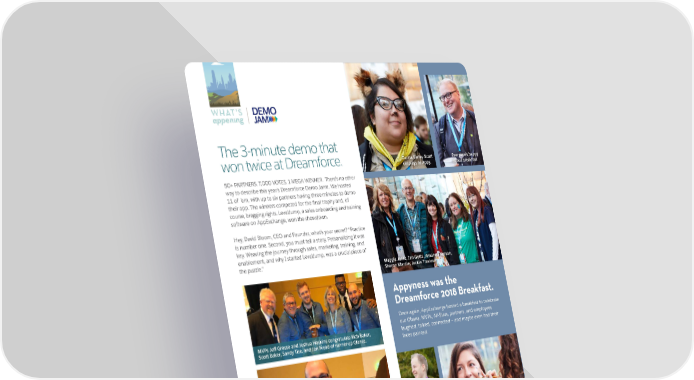 WHAT’S Better data. appening Better sales performance. The 3-minute demo that ™ won twice at Dreamforce. Zarina Varley Scott Everyone’s happy Better get D&B Optimizer. cosplays as Appy. at our breakfast 50+ PARTNERS. 7,000 VOTES. 1 MEGA WINNER. There’s no other way to describe this year’s Dreamforce Demo Jams. We hosted 11 of ’em, with up to six partners having three minutes to demo their app. The winners competed for the final trophy and, of course, bragging rights. LevelJump, a sales onboarding and training software on AppExchange, won the showdown. Hey, David Bloom, CEO and Founder, what’s your secret? “Practice is number one. Second, you must tell a story. Personalizing it was key. Weaving the journey through sales, marketing, training, and enablement, and why I started LevelJump, was a crucial piece of the puzzle.” Maggie Jolitz, Ian Gotts, Amanda Nelson, Sharon Klardie, Jackie Travieso Appyness was the Dreamforce 2018 Breakfast. Once again, AppExchange hosted a breakfast to celebrate our Ohana. MVPs, All-Stars, partners, and employees laughed, talked, connected — and maybe even had their MVPs Jeff Grosse and Joshua Hoskins congratulate Rich Baker, Scott Baker, Sandy Tise, and Jon Mead of runner-up Glance. faces painted. Jeremiah Dohn An All-Star gets Appyfied. Leslie Tom and Amanda Nelson pose with Mega Demo Jam winner David Bloom of LevelJump. These are the names L-R Dreamforce Demo Jam winners include: With your data up to date and better maintained using D&B Optimizer, you could realize a 66% rise in revenue.* bit.ly/DBoptimizer AppExchange’s Howard Chen Shonnah Hughes * “The Impact of Bad Data on Demand Creation,” SiriusDecisions. 8 THE EXCHANGE SUMMER 2018 FALL 2018 THE EXCHANGE 9