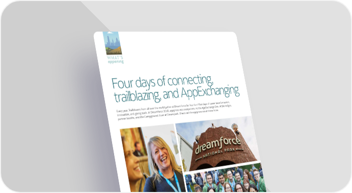 WHAT’S appening Four days of connecting, trailblazing, and AppExchanging Every year, Trailblazers from all over the world gather at Dreamforce for four fun-filled days of career transformation, innovation, and giving back. At Dreamforce 2018, appyness was everywhere. At the AppExchange Den. At the lodges, partner booths, and the Campground. Even at Dreampark. Check out the appyness on all these faces. 12 THE EXCHANGE FALL 2018 FALL 2018 THE EXCHANGE 13