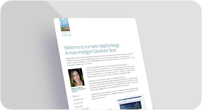 They’re free. WHAT’S appening They’re customizable. Welcome to a smarter AppExchange: A more intelligent Salesforce Store. They’re AppExchange is all about helping Trailblazers find smart solutions to help them transform their businesses. In fact, 88% Salesforce of Salesforce customer orgs use AppExchange solutions. To make the customer experience more personalized and easier to navigate, we launched a smarter AppExchange. Now customers who log in will find the right solutions — and find Labs. them faster — thanks to two new features: SMARTER RECOMMENDATIONS: EXPLORE PERSONALIZED SUGGESTIONS. Scroll through the new “Recommended for You” tab for suggested solutions based on your location, install history, profile data, and more. For example, imagine a business focused on project management. As soon as the admin searches for — or installs — an app to schedule appointments, the recommendations will reveal relevant, complementary apps. LIGHTNING FLOW ACTIONS: EMBRACE AUTOMATED PROCESSES. These partner-built, drag-and-drop solutions unleash the full potential of automated business HEATHER CONKLIN processes. They ensure that every Lightning Flow is plugged into each customer’s data, apps, VP Product Management and services. There are already more than a dozen partner-built Flow Actions — like running Salesforce credit checks, posting to Slack, or generating quotes for loan processing. “ 88% of AppExchange is for every Salesforce customer — no matter the size of your company, your Salesforce department, or the industry you’re trailblazing. We hope you’re as excited about a Smarter customer AppExchange as we are. orgs use AppExchange solutions.” Personalized recommendations and new Lightning Flow Actions can help transform your business Built by Salesforce employees, Salesforce Labs are free solutions to help you solve business challenges faster. There are over 350 of them. Did we mention that they’re free? See more at bit.ly/appexlabs 6 THE EXCHANGE FALL 2018 FALL 2018 THE EXCHANGE 7