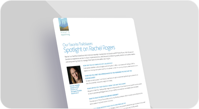 WHAT’S appening Our Favorite Trailblazers: Spotlight on Rachel Rogers Rachel is a Certified Salesforce Administrator recently inducted into the Salesforce MVP Hall of Fame. With 15 years of Salesforce experience across multiple implementations, she’s focused on delivering quality solutions to business leaders and empowering them to manage their teams to innovative new heights. HOW DID YOU GET INVOLVED WITH SALESFORCE? It all started with the luckiest Google search of my life. In 2004, I was tasked with finding a CRM to replace our homegrown system and found a phone number for a young company called salesforce.com. WHEN DID YOU FIRST USE APPEXCHANGE? DO YOU REMEMBER THE FIRST APP YOU DOWNLOADED? It’s been so many years, I can’t recall. I was lucky enough to watch the AppExchange launch and turn RACHEL ROGERS into the powerful, resourceful engine it is today. Salesforce MVP Director of IT WHAT APP DO YOU FIND YOURSELF USING TIME AND TIME AGAIN? HD Supply Facilities Maintenance My go-to is Field Trip. Having a clean org is incredibly important. If you have too much junk it’s hard for people to report, processes get bogged down, and your ability to innovate at an accelerated pace is hindered. WHAT IS YOUR FAVORITE DREAMFORCE MEMORY? The best part of Dreamforce is the community. Getting to interact with innovators across industries has fitness tracker will be shocked at how much ground you led to some of my best creative moments. meetups. Add 20 minutes of walking to your daily fitness WHERE'S YOUR FAVORITE PLACE YOU'VE EVER TRAVELED TO? Recently I had the chance to go to Grenada. It was a very peaceful retreat that gave me time to focus and difference. come back ready for new challenges. It’s a gorgeous little island with very friendly people. WHO DO YOU CONSIDER TO BE YOUR MENTOR OR IDOL? I keep a small group of close confidents. We bring together diverse opinions, so decisions can be made by looking through different lenses versus one single viewpoint. It has helped me tremendously. WHAT DOES BEING A TRAILBLAZER MEAN TO YOU? Never giving up, embracing change, and helping others along the journey. The Trailblazer community has the ability to change the way others are impacted by the technology they run, the communities they live in, and the opportunities they provide. WHAT ADVICE DO YOU HAVE FOR OTHER TRAILBLAZERS? The only constant is change and the important thing is what we do with it. You will fail at times. Fail quickly, learn, and create the next great change movement that will empower people to forge forward. You have the ability to be the ultimate change agent in your family, your career, and the community. 8 THE EXCHANGE FALL 2019 FALL 2019