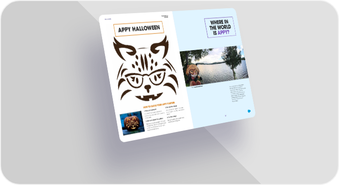 FUN & GAMES THE EXCHANGE FALL 2020 APPY HALLOWEEN WHERE IN THE WORLD IS APPY? Photo: Zarina Varley Scott Tell us where she is at #AppyTravels and we’ll feature your answer in lots of social media. You’ll be a rockstar. HOW TO CARVE YOUR APPY PUMPKIN Got an idea for the next Where in the World Is Appy? Send us your 1. Prep your pumpkin 3. Transfer the design photo of Appy in any destination at #AppyTravels and you might be Cut a lid off the top or a hole in the Use a poker tool or pushpins to mark featured in the next issue of bottom of your pumpkin and scrape the dots along the lines. Then, remove the The Exchange. inside clean. pattern. 2. Print and attach the pattern 4. Cut the design Tape or pin to your pumpkin. (If it’s not Saw gently along the dotted lines to the right size, reduce or enlarge on your reveal Appy’s smiling face. printer first.) Folds are fine, just try to keep lines matched up. 37