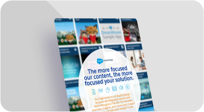 The more focused our content, the more focused your solution. You’ll get more out of AppExchange because we integrated content and trails throughout the site. So now best practices, insights, and community thought leadership are delivered straight to you. get more at bit.ly/appexcontent SPRING 2018 THE EXCHANGE 7