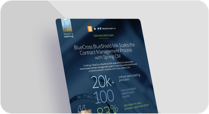 + WHAT’S appening CUSTOMER SPOTLIGHT BlueCross BlueShield MA Scales the Contract Management Process with Spring CM Challenge: BlueCross BlueShield MA needed flexible and scalable cloud-based contract management system to track the end-to-end lifecycle of dental providers’ contracts within each partner plan. unique participating 20k+ providers new providers added each month 100 decrease in new % provider approval time 83 Get an app that is configurable and nimble, allowing you to achieve goals in a fast timeframe.” LEEANN MITCHELL DIRECTOR DENTAL NETWORK MANAGEMENT BLUECROSS BLUESHIELD MA 8 THE EXCHANGE SPRING 2018