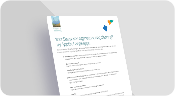 WHAWHATT’’SS WHAT’S appappenineningg appening Your Salesforce org need spring cleaning? Try AppExchange apps. Our favorite Trailblazers: Spotlight on Radhika Bansal Radhika is a Business and Integration Arch. Sr. Analyst at Accenture, and loves coding, consulting, and leadership. We’ve all heard of Marie Kondo, right? Her popular TV show and book help people organize their homes. Now her She’s done presentations at Dreamforce, Salesforce World Tours, and community events worldwide. Her dedication to women’s empowerment raised membership in Pune Women In Tech to 300 in just two years. She’ll continue this work concept can even be applied to Salesforce — and AppExchange apps can make it easy. until equality is no more a topic to discuss but a regular activity. 1 Visualize the goal. What would your Salesforce org look like if it were clean and tidy? Use AppExchange HOW DID YOU GET INVOLVED WITH SALESFORCE? data cleansing apps to identify what “sparks joy” in your org — and what doesn’t. I was working as a developer. Out of a batch of 60 developers only three were selected for Salesforce development. I was one of the lucky ones. Elements Cloud Catalyst Insightful analytics including field usage and the percentage completed. WHEN DID YOU FIRST USE APPEXCHANGE? WHAT'S THE FIRST APP YOU INSTALLED? Data Quality Analysis Dashboard I started using AppExchange in 2013. I installed a free, unmanaged package in my developer org. The first app I installed was Conga Composer. Identify deficiencies, quality, and completeness in your record data. RADHIKA BANSAL Salesforce MVP 2 Determine what sparks joy. Let's remove the stuff that holds your org back from being all it can be. Business and Integration WHICH APP DO YOU FIND YOURSELF USING TIME AND TIME AGAIN? Arch. Sr. Analyst I really like the intuitive and user friendly UI of GetFeedback. Look for inactive users, outdated, duplicate, or unused data, even installed — but untouched — Accenture AppExchange packages. WHAT IS YOUR FAVORITE DREAMFORCE MEMORY? Clean Your Room! Dashboard Last year was my first Dreamforce and every part of it was special. My favorite memory Inspire sales teams with a weekly pipeline "housekeeping" dashboard. was when Sarah Franklin allowed me to interview her. It was a dream come true. Field Trip WHERE’S YOUR FAVORITE PLACE YOU’VE TRAVELED TO? It’s one I've yet to explore: Switzerland, because of my unbound love of mountains. Run reports on Salesforce fields to analyze what percentage have populated. 3 Tidy in order. Now you’ll want to back up information, aggregate old data, change folder permissions, WHAT’S THE LAST BOOK YOU READ? Imagine It Forward by Beth Comstock. and more in the order that works best for you. Flows, configurations, and daily backup apps can help. CMTD Enhanced Related List (Component) GOT A MENTOR OR IDOL? Marc Benioff for his unshakable dedication and concern for society. Don't clutter: Group related records in this configurable component. Flow Magic – Picklist (Flow Solution) WHAT DOES BEING A TRAILBLAZER MEAN TO YOU? People who are honest toward their vision and help others to achieve theirs. Convert your picklist fields into visually engaging selectors in seconds. Astro Sounds daunting? Relax. AppExchange data cleansing apps make it a breeze. WHAT ADVICE DO YOU HAVE FOR TRAILBLAZERS? Be clear, passionate, and dedicated to your goal — but don’t forget to enjoy and be Once you’ve finished, don't forget to celebrate your newly cleaned org. Codey grateful for every path you take because every path is beautiful. 12 THE EXCHANGE SPRING 2019 SPRING 2019 THE EXCHANGE 13