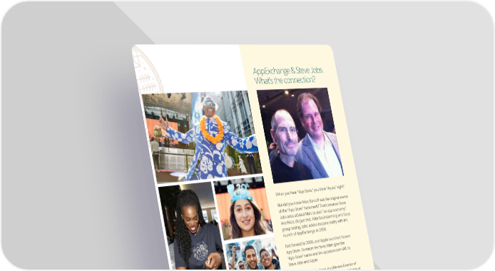 AppExchange & Steve Jobs: WHAT’S What's the connection? appening Salesforce’s 20th anniversary: Speeches, cupcakes, and a Pitbull. Marc Benioff and Parker Harris started Salesforce in 1999. We celebrated this awesome milestone with a blowout concert featuring Grammy-winning rapper Pitbull. There was also lots of VTO, giveaways of designer cupcakes, and more. Here’s to another 20. Then another 20. Well, you get the idea. When you hear “App Store,” you think “Apple,” right? But did you know Marc Benioff was the original owner of the “App Store” trademark? That's because Steve Jobs once advised Marc to start “an app economy.” And Marc did just that. After brainstorming and focus group testing, Jobs’ advice became reality with the launch of AppExchange in 2006. Fast forward to 2008, and Apple launched its own App Store. To return the favor, Marc gave the “App Store” name and the appstore.com URL to Steve Jobs and Apple. “When I joined Salesforce, my title was Director of the App Store,” said Leyla Seka, now EVP of Mobile at Salesforce. With a slight title change, Leyla became the first Director of AppExchange in 2008. “I witnessed the creation of the largest and most vibrant enterprise app ecosystem in the world.” With a little help from Steve Jobs, of course. 8 THE EXCHANGESPRING 2019 THE EXCHANGE 9
