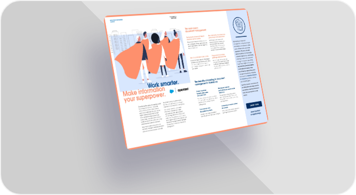 NEWS FROM OUR PARTNER THE EXCHANGE opentext SPRING 2023 The cost of poor document management: Inaccessible documents impact Poor information flows decrease customer service quality. productivity and collaboration. Documents in disconnected silos result in Inefficiencies with internal and manual searches, delays, and costly errors, external document processes can By investing in document extending resolution time that negatively cause inconsistencies between impacts customers. Salesforce data and documents, management, companies can put causing dissatisfied employees information and customers at the and poor customer relationships. center of their sales and service operations. This can ultimately Out-of-control information is risky. Fragmented information result in positive and memorable If customer documents are mismanaged prolongs sales cycle time. customer experiences. Additionally, and not controlled, it creates compliance, Failure to find and relay the right security, and financial consequences, documents and related information investing in connected document potentially damaging to customers and quickly can result in poor business management powers your ability your brand. decisions and undesired outcomes to gain key insights and spot new with customers. opportunities, providing visibility to the right information when and where it’s needed. Document Work smarter. The benefits of investing in document management solutions, including management in Salesforce: the ones in the OpenText solutions Make information for Salesforce portfolio, can help your superpower. your business grow. Shorten resolution Manage all customer OpenText provides customers with times to close cases and business documents inside an information advantage over the and deals faster. Salesforce. competition, enabling information Ov important to satisfy customer needs, er the last fe w y ears, the bu siness w orld Real-time access to all customer-related This enables an enhanced customer h but also to delight customers with great to be their superpower to work as ch ang ed c omple t ely — especially documents directly within the Sales Cloud view, making action tasks smarter and in the v experiences that keep them coming back. elocity a t which in form a tion is and Service Cloud streamlines the faster, which leads to better productivity smarter. u sed. As w e se ttle in t o this ne w norm al, Our partner OpenText, a leader in whole process. and experiences. higher c u st omer e xpecta tions need information management, helps t o be sa tisfied t o help n urtur e these companies securely capture, govern, View business data Collaborate on mission-critical r ela tionships, and in t ern al in form a tion and exchange information on a global w alongside documents. documents. ork flo ws need t o be op timiz ed t o align scale. Here, the company demonstrates Learn more with these ne w c u st omer dem ands. what happens when a company has poor Securely share to key stakeholders Keep information concerning business Ho document management and highlights internally and externally to your company. specific processes in one system. w mission-critical doc umen ts ar e cap the benefits of investing in document tur ed, m an ag ed, and deliv er ed within sales and servic management. about OpenText e pr oc esses is no t only on AppExchange.