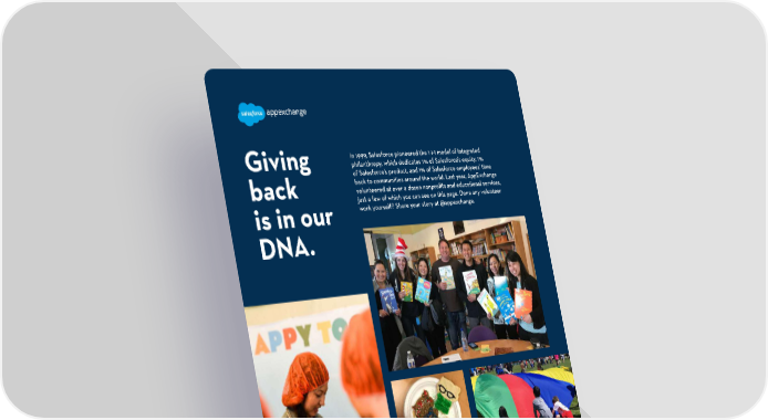 Giving In 1999, Salesforce pioneered the 1-1-1 model of integrated philanthropy, which dedicates 1% of Salesforce’s equity, 1% of Salesforce’s product, and 1% of Salesforce employees’ time back to communities around the world. Last year, AppExchange back volunteered at over a dozen nonprofits and educational services, just a few of which you can see on this page. Done any volunteer is in our work yourself? Share your story at @appexchange. DNA.