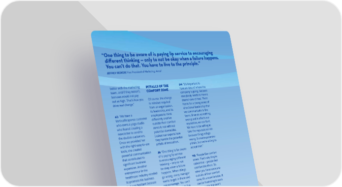 “At Aircall, we evaluate “ One thing to be aware of is paying lip service to encouraging unconventional, innovative different thinking — only to not be okay when a failure happens. thinking, it provides a basis on whether they have inspire innovation, and different way of looking drive disruption. There are You can’t do that. You have to live to the principle.” essentially means: Are they JEFFREY REEKERS Vice President of Marketing, Aircall which gives people variety. but a favorite is how People like variety — they things outside their job Netflix used SurveyMonkey like to figure out a different profile? Are they generally way to solve the same fearless, not reckless? I better with the marketing PITFALLS OF THE SW: “It’s important to problem. It emotionally think when people have content. Netflix learned team, and if they weren’t, COMFORT ZONE. have an idea of where the that 58% of pet owners bonuses would not pay company is going, because out as high. That’s how you Of course, the change everybody needs to have a think unconventionally, 46% of the couples who shared view of that. There drive real change.” in mindset required from an organization, has to be a strong sense of things that are innovative, its leadership, and its directional leadership that az: “We have a employees to think we communicate to the “At Boomi, people VerticalResponse customer who owns a yoga studio differently and live team. If we do something have ownership of what “I’ve worked with outside their comfort wrong and it affects our large enterprises that have who feared creating a zones is not without reputation, we can fix it. newsletter to send to potential downsides. We have to be willing to initiatives driven from the studio’s customers. take the reputational risk I asked our experts how just get on with it. They Executives, employees, the C-suite down. They Once we provided her they handle the potential because things will go have a strong sense of know they need to drive with the right easy-to-use wrong. It creates potential pitfalls of innovation. autonomy and decision- tools, she created pitfalls, but we’re willing to doing the day-to-day work powerful communication JR: “One thing to be aware accept that.” problem to solve and are nervous. They have to that contributed to of is paying lip service to get their jobs done. significant business WS: “People like comfort to encouraging different If something goes wrong, from their customers. It’s expansion. Another thinking — only to not zones. That’s why they’re we’ll course-correct. zone. One of the things I entrepreneur in the be okay when a failure called that — people feel I trust my team to make customers are innovating healthcare industry needed happens. When things comfortable there. So tied C-suite bonuses to to promote his business when you force someone go wrong, every manager but was hesitant because wants to get in there and outside of their comfort he didn't have any micromanage. You can’t zone, it’s uncomfortable. It have very low staff attrition customers use SurveyMonkey marketing experience. do that. You have to live can be frustrating to work every day to gather the By taking the plunge to to the principle and allow with people that aren't promote his business that to be a natural part natural disruptors. Rather with the right tools, he of the learning process, than working around them, gained the marketing and understand that if have a conversation. Ask if skills he needed and his you’ve hired good people, there's a fear or experience business grew significantly.” it will be okay in the end.” that caused them to be SUMMER 2018 SUMMER 2018 THE EXCHANGE 21