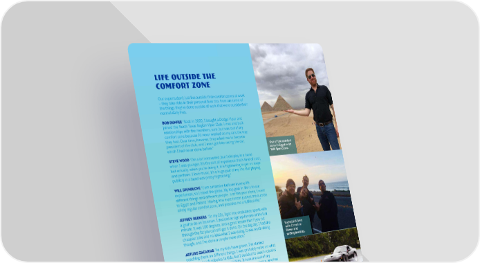 cautious. Then give clear Life outside the direction on how moving has interviewed at our comfort zone all-hands meetings some “One thing I was Our experts don’t just live outside their comfort zones at work of the most innovative, — they take risks in their personal lives too. Here are some of the things they’ve done outside of work that were outside their normal daily lives. I tell them to find an government, including internal champion. If you BOB DUNFEE “Back in 2000, I bought a Dodge Viper and Even if the benefits of have an idea on how to joined the North Texas Region Viper Club. I met and built Williams, Draymond Green, thinking differently and relationships with the members, sure, but was out of my comfort zone because I’d never worked on my cars the way say so. When Bill Gates they had. Over time, however, they asked me to become president of the club, and I even got into racing the car, Out of the comfort put competitive teams which I had never done before.” zone in Egypt with to do. I wanted to know Will Spendlove. how companies can offer STEVE WOOD “I’m a bit introverted, but I did play in a band when I was younger. It’s the sort of experience that’s kind of cool, the proper environment processor. Team B, you but actually, when you’re doing it, it is frightening to get on stage for work to flourish. of innovation requires and perform. I love music, it’s a huge part of my life. But playing publicly in a band was pretty frightening.” understand that innovation WILL SPENDLOVE “I am a massive believer in new life a job.’ Those are stressful experiences, so I travel the globe. My top goal in life is to see and disruptiveness different things and different people. Just this year alone, I went to Egypt and Poland. Having new experiences pushes me outside relevant. Innovation of my regular comfort zone, and provides me a fulfilled life.” “Given that our out, is critical to having JEFFREY REEKERS “In my 20s, I got into endurance sports with a goal to do an Ironman. I decided to sign up for one at the last employee value minute. It was 100 degrees, and a good lesson that if you cut and the customer benefit. through the fat you can still get it done. On the big day, I had the Bucket list time cheapest bike and no idea what I was doing. It was worth doing with Christine require an NBA player though, and I’ve done a couple more since.” Rimer and visiting your company surfing buddies. ARTURO ZACARIAS “As my kids have grown, I’ve started We have a program called coaching them on different things. I was probably naive on what the Goldie Speaker series, environment of innovation, it takes to teach robotics to kids, but I decided to coach robotics to a team of eight-to-10-year-old kids. It took me out of my ask themselves ‘Why not?’ Dave Goldberg, who loved comfort zone, but it’s been a very rewarding experience, and has gotten me closer to my daughter and her friends.” CHRISTINE RIMER “A few years ago, I went to a surf camp as a ‘bucket list’ item with no intention of surfing again in the icy, shark-ridden waters of Northern California. Yet eight years Bob Dunfee later, I paddle out regularly at dawn with a group of guys. I get risk taking on a pummeled, but every once in a blue moon I catch a great wave. Dodge Viper. Surfing really is my courage-building activity.” SUMMER 2018 SUMMER 2018 THE EXCHANGE 23