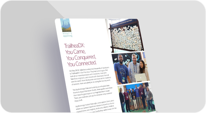 WHAT’S appening TrailheaDX: You Came, You Conquered, You Connected. with it, transforming consumers’ expectations. Because of this, connectivity — and specifically, integration — is top of On May 29-30, Salesforce welcomed thousands of developers to TrailheaDX in San Francisco. They had come to get a first look at our newest products and innovations, meet with Salesforce engineers, and network with developers from all over the world. From the keynote and classes to the hundreds of sessions, there was plenty to do during the two-day event. The AppExchange Vista was bubbling up with great ideas thanks to Appy's Brainstorm Booth, where guests could share their ideas for great apps on our huge brainstorm board. There, you could also pick up the exclusive camp counselor makes it increasingly difficult to have a model of growing revenue and scale. With an increase in IT projects year over Appy plush. AppExchange hosted three epic, action-packed Demo Jams where our partners had three minutes to duke it out for our coveted Demo Jam trophies. In the end, Jitterbit, Profile & Permission Set Helper, and OwnBackup walked away with the much-sought-after awards. SAVE THESE DATES AUGUST 7-9 Midwest Dreamin’ SEPTEMBER 16-17 Northeast Dreamin’ NOVEMBER 19-22 Dreamforce 2019 10 SUMMER 2019 SUSUMMMMEERR 22001199