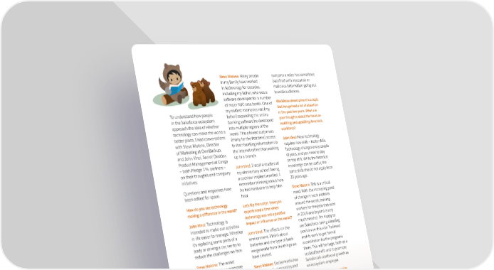 Steve Malone: Many people everyone a voice has sometimes in my family have worked backfired with inaccurate or time off. We also have an internal in technology for decades, malicious information going out partner, we offer a discount including my father, who was a to wide audiences. to all nonprofit prospects and software developer for a number of major NYC-area banks. One of Workforce development is a topic to support numerous nonprofit my earliest memories was [my that has gained a lot of attention Marc Benioff has gone on record To understand how people father] expanding the online in the past few years. What are in the Salesforce ecosystem banking software he developed your thoughts about the focus on approach the idea of whether into multiple regions of the reskilling and upskilling America’s technology can make the world a world. This allowed customers workforce? better place, I had conversations (many for the first time) access John Vinci: with Steve Malone, Director to their banking information via New technology of Marketing at OwnBackup, the internet rather than walking requires new skills — better skills. and John Vinci, Senior Director, up to a branch. Technology changes every couple Product Management at Conga of years, and you need to stay — both Pledge 1% partners — John Vinci: I recall a student at on top of it. While the historical on their thoughts and company my elementary school having knowledge can be useful, the initiatives. a cochlear implant inserted; I same skills should not apply from that our global offices always remember thinking about how 20 years ago. Questions and responses have he had hardware to help him been edited for space. hear. Steve Malone: This is a critical need. With the increasing pace How do you see technology of change in work patterns Let’s flip the script. Have you of the office to give back. Each making a difference in the world? experienced a time when around the world, training John Vinci: technology was not a positive workers for the jobs that exist Technology is in 2019 and beyond is very intended to make our activities impact or influence on the world? much needed. I’m happy to in life easier to manage. Whether John Vinci: it’s replacing some parts of a The effects on the see Salesforce taking a leading body or driving a car, we try to environment. I think about position on this with Trailhead reduce the challenges we face. batteries and the type of trash and its work to get formal we generate from the things we accreditation for the programs Steve Malone: The world have created. there. This will be huge, both as a moves faster when everyone Steve Malone: Social media has societal benefit and to promote is connected. This enables enabled both companies and Salesforce’s continued growth as individuals greater opportunity individuals to broadcast their an ecosystem employer. to change their situation faster messages to a broader network What are ways your companies than ever before. of people than ever before. The give back? What’s the earliest memory you downside here is that giving Steve Malone: have of technology making a We believe it’s important to give back difference? and innovate with confidence on the 18 THE EXCHANGE SUMMER 2019 SUMMER 2019