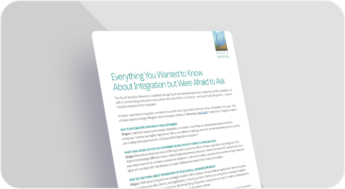 WHAT’S appening Everything You Wanted to Know About Integration but Were Afraid to Ask The Fourth Industrial Revolution is radically disrupting almost every business sector, expanding what is possible, and with it, transforming consumers’ expectations. Because of this, connectivity — and specifically, integration — is top of mind for everyone in the ecosystem. To better understand integration, we talked to experts from organizations that eat, sleep, and breathe this space. One of these experts is Allegra Margolis, Senior Manager of Product Marketing at MuleSoft. Some of her insights are below. to TrailheaDX in San Francisco. They had come to get a first WHY IS INTEGRATION IMPORTANT FOR CUSTOMERS? Allegra: Customers expect personalized interactions, no matter where they are. Data and processes within the enterprise, however, are highly fragmented. We’re committed to helping customers orchestrate these systems quickly and nimbly, both systems within and beyond the Salesforce ecosystem. WHAT CHALLENGES DO YOU SEE CUSTOMERS FACING WHEN IT COMES TO INTEGRATION? Allegra: Enterprises today have around 900 applications, but only a third of those applications are integrated. This makes it increasingly difficult to have a model of growing revenue and scale. With an increase in IT projects year over year, there needs to be a smarter approach to integration. We want to help customers do more than simply “keep the lights on” and deal with maintenance; we want Trailblazers to spend their time on innovation. HOW DO YOU THINK ABOUT INTEGRATION IN YOUR OVERALL BUSINESS STRATEGY? Allegra: Think about integration as a strategic enabler of the business. To truly build an application network requires coveted Demo Jam trophies. In the end, Jitterbit, Profile & connectivity across data, devices, and applications, including partners. Partners provide greater leverage in helping customers build a connected experience. By demystifying integration, companies can begin to better understand and craft a strategy to tap into the open ecosystem opportunity that lies ahead. Get more integration insights from Allegra Margolis and experts from Jitterbit, Dell Boomi, and Workato in our e-book 4 Experts Answer Top-of-Mind Integration Questions. You can also check AppExchange's Integration App Guide. SUMMER 2019 SUSUMMMMEERR 22001199 THETHETHE EXCHANGE EXCHANGE EXCHANGE 1111