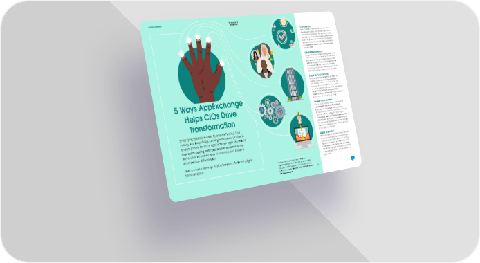 LOOKING FORWARD THE EXCHANGE SUMMER 2021 Compliance Strong foundations are essential before you start to drive digital innovation. Having solid compliance in place builds confidence and trust and demonstrates that quality and improvement are key business values. AppExchange apps cover everything from employee and customer compliance to regulatory compliance and operating standards, helping to ensure you have the basics right. Customer Experience The key consideration when improving systems and processes is how you can deliver better services for the end user. To help you build stronger customer relationships, AppExchange solutions help improve communications across all channels, facilitating seamless user experiences and equipping teams with data tools to uncover powerful marketing insights. Employee Engagement Of course, great experiences don’t just matter for customers. Focusing on employee experience and engagement is an essential investment, and technology plays a huge part in company culture, recruitment practices, staff onboarding, and employee wellness. There are lots of innovative solutions 5 Ways AppExchange available to help you deliver more for your employees and business, and fuel significant change. Process Improvements Helps CIOs Drive Often a lack of integration between departmental systems leads to business inefficiencies, with disjointed, manual processes draining resources. Transformation By implementing apps that can automate and digitize processes, CIOs can leverage this technology to achieve better quality and insights, enable seamless Simplifying systems in order to boost efficiency, save ERP integration, and drive toward a paperless office. money, and keep things running without any glitches is Plus, the value of AppExchange is that each of these solutions runs through the same platform, giving you a major priority for CIOs. AppExchange apps can reduce a rich, single view of activity. time spent dealing with routine system maintenance, Digital Innovation and enable innovative ways to monetize and become On top of these foundational initiatives, CIOs are constantly looking to the future and thinking of a competitive differentiator. game-changing projects that push the status quo. Digital transformation is a constant demand on Here are just a few ways AppExchange can help with digital businesses, and to achieve it, CIOs require apps that can significantly drive innovation, supporting transformation. change management and agility across the whole Whatever area of business you need to enhance, organization. AppExchange has a whole host of ways you can accelerate your goals and drive transformation. For more information, download the e-book “The CIOs Guide to Transformation 31 with AppExchange.”