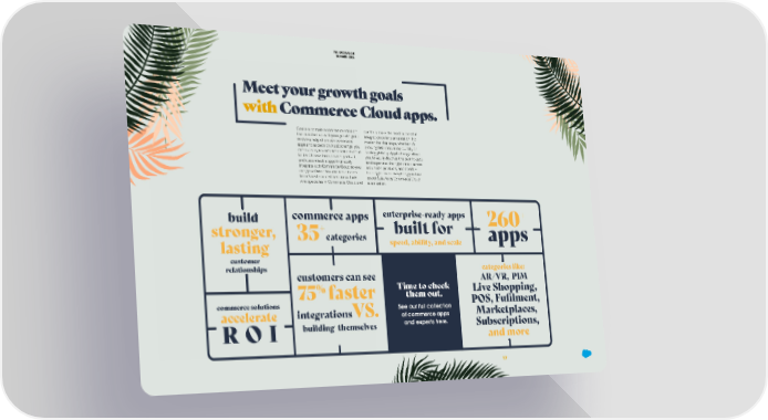 THE EXCHANGE SUMMER 2022 Meet your growth goals with Commerce Cloud apps. Create a complete commerce solution can help make the most successful that matches up with your growth goals. integration or implementation. No With the help of proven commerce matter the challenge, whether it’s apps and experts on AppExchange, you growing fast, innovating quickly, or can build loyalty and accelerate revenue scaling globally, AppExchange allows faster. Choose from proven, prebuilt, you to easily discover the best-fit apps and customizable apps that easily and experts at the right time – across integrate with Commerce Cloud so you industries, products, and needs — can grow faster. You can also choose helping to make everything you love from Salesforce-certified consultants about Salesforce Commerce Cloud who specialize in Commerce Cloud and even better. d commerce apps enterprise†read‡ apps buil , built „or er strong € categories s lasting speed, abilit‡, and scale app er om cust e: ories lik eg t a s c tionship rela customers can see AR/VR, PIM ƒ Time to check opping, e Sh v ‚€ „aster them out. Li t, en ufilm S, tions P lu e so erc omm c See our full collection es, c la tp e e integrationsVS… of commerce apps Mark t a er el c c a and experts here. tions, scrip RI building themselves Sub ore d m an 17