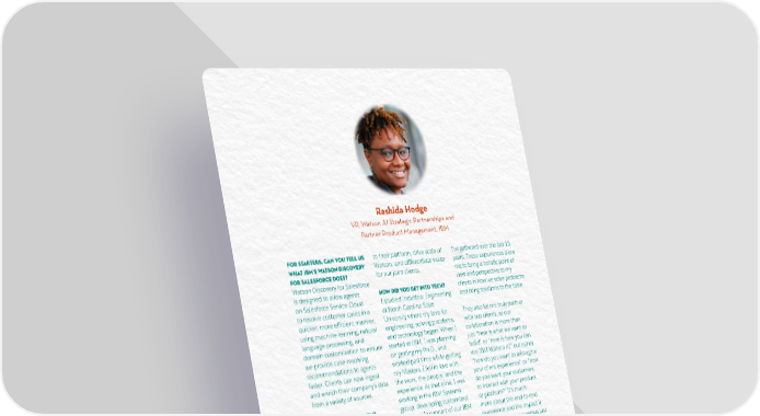 pursue their dreams, specifically scale and help them make a We want to make sure we're in areas of STEM. If I didn’t difference in society. That's fun, not laggards when it comes work in tech, but could still do awesome, and amazing. to technology, but also want something like this full time and to make sure we do right for help others along, especially What are the biggest the user. We’ve learned that those who society labels as challenges you face in tech? it’s easy to build technology, disenfranchised or unable to We live in a world where things but we need to ensure that we make it, that would be my life. are moving fast. Before, it would build technology that solves take years to develop a product problems, delivers value, and Many times people say to me and go-to market. Now, that’s drives differentiation. Rashida Hodge “Oh, you're not going to make changing from months to VP, Watson AI Strategic Partnerships and it. Your mother is a teenage weeks. In some cases, the speed Any advice for those looking Partner Product Management, IBM parent,” and many other societal of change continues to be a to get into tech? Be open, labels. But people invested in challenge for many enterprises. be present, and have a spirit of me. They mentored me. They While they’re fascinated and exploration. We often go in to FOR STARTERS, CAN YOU TELL US to their platform, drive scale of I’ve gathered over the last 15 saw potential in me before I saw excited with the ability to fields or study things because we WHAT IBM’S WATSON DISCOVERY Watson, and differentiate value years. These experiences allow potential in myself and because innovate, many companies are what we see. I grew up on FOR SALESFORCE DOES? for our joint clients. me to bring a holistic point of of their investment I can do the struggle to keep up with the 32 square miles in St. Thomas, Watson Discovery for Salesforce view and perspective to my same for others. Seeing others pace of innovation that’s U.S. Virgin Islands, but given my is designed to allow agents How did you get into tech? clients in how we solve problems thrive — and this is my focus required to remain competitive. desire to be curious, I’ve been on Salesforce Service Cloud I studied Industrial Engineering and bring solutions to the table. each day — would be a dream. to over 50 countries all over the to resolve customer cases in a at North Carolina State More importantly, while keeping world, said yes to the jobs most quicker, more efficient manner, University where my love for They also let me truly partner What do you like about pace is critical, a business also people say no to, and open using machine learning, natural engineering, solving problems, with our clients, as our working in tech? Well, each needs to ensure they provide myself up to try anything once. language processing, and and technology began. When I collaboration is more than day is different. One of the the right solution, for the right domain customization to ensure started at IBM, I was planning just “here is what we want to things for me is innovation problem, for the right client, at Who would’ve thought a girl we provide case-resolving on getting my Ph.D., and build” or “here is how you can and change. From a tech the right time. with a teenage parent would be recommendations to agents worked part time while getting use IBM Watson AI” but rather perspective, I look back at leading a large AI team? That faster. Clients can now ingest my Masters. I fell in love with “how do you want to reimagine my 15 years at IBM — I‘ve had happened because I’ve always and enrich their company's data the work, the people, and the your client experience” or “how more than 10 jobs. I‘ve had to been open to new experiences. from a variety of sources. experience. At that time, I was do you want your customers upskill and learn new things I’ve always said yes to the new. working in the IBM Systems to interact with your product continuously. The exciting part There’s a Robert Frost quote What do you do at IBM? group, developing customized or platform?” It’s much is that every day is different, I live by: “Two roads diverged I have the opportunity to solutions in support of our IBM more about the end-to-end every year is different, and in a wood, and I took the road advance our Watson technology Personal Computer Division experience and the impact it every job brings an awesome less traveled by.” I think for by working with clients and Operations Team. has on the end user versus just new challenge. For a company people interested in getting into partners to embed Watson focusing on the technology. It like IBM, with 400,000-plus technology, or changing fields, AI into their cloud-based The great thing should never be about the employees, in 170 countries or doing something different, platforms. I work across all our about IBM is technology alone. across the world, not only do say yes. Say yes to those roads ISV and Cloud Providers like the breadth I get to influence how offerings that are less traveled by. Salesforce, Box, Workday, SAP, and depth of What would you do if and products are brought to and others. Ultimately, we work experience you didn’t work in tech? market, but I get to interact with our partners to determine My passion is to help other with clients on a global how we can add intelligence women and people of color 18 THE EXCHANGE THE EXCHANGE 19