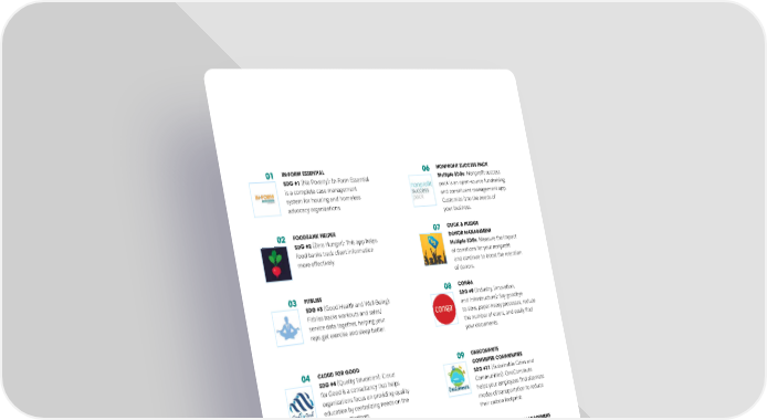 WHAT’S APPENIN’ THE EXCHANGE WINTER 2020 01 IN-FORM ESSENTIAL 06 NONPROFIT SUCCESS PACK SDG #1 (No Poverty): In-Form Essential Multiple SDGs: Nonprofit success is a complete case management pack is an open-source fundraising system for housing and homeless and constituent management app. Customize it to the needs of advocacy organizations. your business. 02 FOODBANK HELPER 07 CLICK & PLEDGE SDG #2 (Zero Hunger): This app helps DONOR MANAGEMENT Multiple SDGs: Measure the impact SQUAD GOALS: food banks track client information of donations for your nonprofit more effectively. and continue to boost the retention SUSTAINABILITY FOR of donors. 03 FITBLISS 08 CONGA OUR FUTURE SDG #3 (Good Health and Well-Being): SDG #9 (Industry, Innovation, and Infrastructure): Say goodbye Fitbliss tracks workouts and sales/ service data together, helping your to slow, paper-heavy processes, reduce In 2019, we at Salesforce announced plans to tap into the reps get exercise and sleep better. the number of errors, and easily find your documents. Dreamforce and Salesforce communities to help tackle the world’s most pressing challenges. At Dreamforce, we kicked 04 CLOUD FOR GOOD 09 ONECOMMUTE COMMUTER COMMUNITIES off a year of action to accelerate the United Nation’s 17 SDG #4 (Quality Education): Cloud SDG #11 (Sustainable Cities and Sustainable Development Goals (SDGs). The SDGs were for Good is a consultancy that helps Communities): OneCommute organizations focus on providing quality helps your employees find alternate education by centralizing needs on the developed in partnership by all of the UN member modes of transportation to reduce Salesforce Platform. their carbon footprint. countries as a shared blueprint for peace and prosperity for all people and the planet. Salesforce is playing our part 05 PIPELINE EQUITY 10 SOFI SUSTAINABILITY MANAGEMENT SDG #5 (Gender Equality): Gender SDG #15 (Life on Land): This app with our own set of goals: To donate $17 million and 1 Insights help organizations identify helps organizations create and measure million volunteer hours to support the SDGs by areas of unconscious bias to make sustainability goals, engage with achieving gender equity actionable employees, reduce consumption, and Dreamforce 2020. and attainable. comply with environmental reporting. Join us in action with solutions made to help individuals and businesses achieve the SDGs. Here’s a quick list of 10 AppExchange partners to get you started. 13