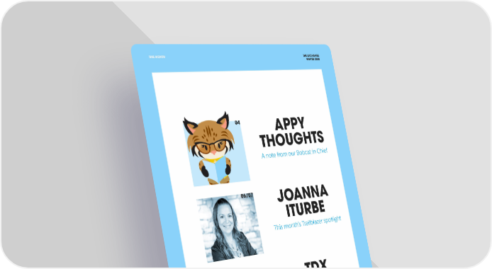 THIS MONTH THE EXCHANGE WINTER 2020 04 APPY 16/17 GOING THOUGHTS INK-LESS A note from our Bobcat in Chief Why e-signatures matter 06/07 JOANNA 22/27 HELLO, ITURBE GOALS This month’s Trailblazer spotlight Resolutions are out, goals are in 10/11 TDX 30/31 SHARE INDIA THE LOVE Our first epic adventure in Bengaluru App-tastic valentines for all 3