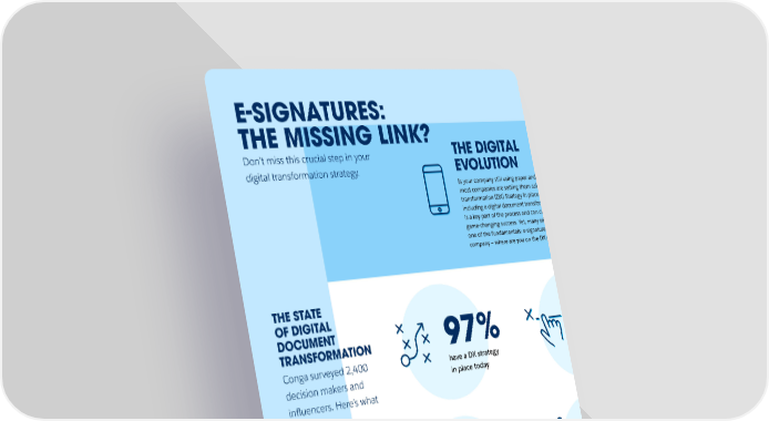 E-SIGNATURES: THE MISSING LINK? Don’t miss this crucial step in your THE DIGITAL SMALL STEPS, EVOLUTION digital transformation strategy. BIG GAINS Is your company still using paper and ink? These days, While a complete, end-to-end document transformation is most companies are setting them aside and have a digital the ultimate goal, small steps can improve the customer and transformation (DX) Strategy in place. They know that organization’s experience with documents. Replacing ink with including a digital document transformation (DDX) strategy e-signature is an easy change that leads to significant gains. is a key part of the process and can create measurable, game-changing success. Yet, many still need to work on one of the fundamentals: e-signatures. What about your company — where are you on the DX path? THE STATE Of those, only OF DIGITAL DOCUMENT 79% 36% TRANSFORMATION 97% have implemented/ still sign business Conga surveyed 2,400 have a DX strategy are implementing documents and in place today decision makers and e-signatures contracts with ink influencers. Here’s what they said. SEE THE FULL SURVEY HERE 17% 48% find capturing have been totally e-signatures and successful in recording an implementing and Ready to take your first step? audit trail to be integrating e-signatures Check out Conga Sign on AppExchange. a problem area organizationwide