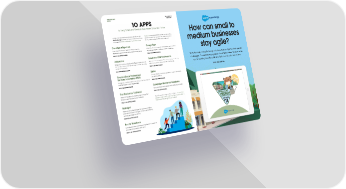 THIS MONTH OUR COMMUNITY THE EXCHANGE ROCKS WINTER 2021 1O APPS to Help Small and Medium Businesses Grow and Thrive How can small to To help small and medium businesses identify the right App Guide. Here are just 10 of the featured apps to help AppExchange solutions for their current business needs, you save time on manual processes, become more data- we created the Small and Medium Business Solutions driven, enable employee collaboration, and more. medium businesses DocuSign eSignature Conga Sign Create agreements with Salesforce data, customize Effortlessly deliver structured, templated communication to agreements, and send them to be signed on any device. any e-signature signer — inside or outside of Salesforce. stay agile? FIND IT ON APPEXCHANGE FIND IT ON APPEXCHANGE JabberJaw Salesforce CRM Dashboards With the help of AppExchange solutions that are right for their specific Collaborate quickly and easily within Salesforce via chat with Help sales and service teams stay on top of every deal or case, challenges. Our newest app guide is chock-full of ideas. Find just what this free app. You can also upload images and files for a fully and close more business on time with this free app. you’re looking for with quick descriptions and customer reviews. optimized experience. FIND IT ON APPEXCHANGE FIND IT ON APPEXCHANGE READ THE GUIDE > FinancialForce Professional Zapier Services Automation (PSA) Connect Salesforce to all the web apps you use and automate your entire workflow. Manage your professional services team, customers, projects, FIND IT ON APPEXCHANGE and financials all in one integrated app. FIND IT ON APPEXCHANGE Campaign Monitor for Salesforce Send personalized and targeted email marketing campaigns. Trail Tracker by Trailhead FIND IT ON APPEXCHANGE Install this free app to guide employees through their Salesforce learning adventure on Trailhead. AppExchange has a large variety of solutions. The new Small FIND IT ON APPEXCHANGE and Medium Business Solutions App Guide makes it easier to find the ones that are right for your business. Gainsight Prevent churn by identifying at-risk customers, creating systematic processes to mitigate concerns, and efficiently ramping up engagement efforts. FIND IT ON APPEXCHANGE Box for Salesforce Centralize documents across your organization to streamline processes and accelerate sales cycles. FIND IT ON APPEXCHANGE 7