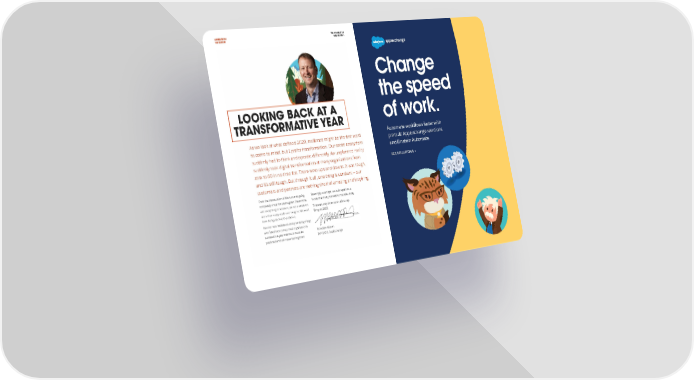 THIS MONTHLETTER FROM THE EXCHANGE THE EDITOR WINTER 2021 Change the speed LOOKING BACK AT A of work. TRANSFORMATIVE YEAR As we look at what defined 2020, resilience might be the first word Automate workflows faster with to come to mind, but I prefer transformation. Our entire ecosystem prebuilt AppExchange solutions suddenly had to think and operate differently. An unplanned reality and Einstein Automate. suddenly took digital transformation at many organizations from SEE SOLUTIONS > zero to 60 in no time flat. There were ups and downs. It was tough, and it’s still tough. But through it all, one thing is constant — our customers and partners are nothing short of amazing and inspiring. From the introduction of Work.com to going Seemingly overnight, we built a path to a completely virtual for a reimagined Dreamforce, future that many considered decades away. and everything in between, we did a whole lot There are only three words left to say: more than many could ever imagine. We went Bring on 2021. from being reactive to proactive. We met new Trailblazers doing amazing things with Salesforce to help their organizations succeed in a year that could never be Woodson Martin predicted and will never be forgotten. EVP & GM, AppExchange