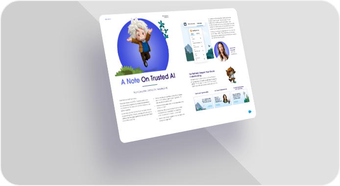 TRUST AND AI THE EXCHANGE Winter 2024 Our approach to building Data Cloud and the new Einstein Copilot Studio — which includes Prompt Builder, Action Builder, and Model Builder — is to provide a trusted, easy-to-use, cutting-edge AI and data platform to enable, de-risk, and accelerate your unique position as the trusted AI advisor to our customers. Thank you for being an integral part of our journey into the AI + Data + CRM + Trust future for our customers. Your expertise, feedback, and partnership are crucial as we build the future together. Clara Shih EVP & GM, Salesforce AI For Partners: Deepen Y A Note On Trusted AI our GenAI Understanding Her e ar e some brie f videos fea turing Su san E merson, S VP specializing in AI, an aly tics, and da ta. Her insigh ts highligh t the ne w oppor tunities the Einst ein C opilo t from Clara Shih, EVP & GM, Salesforce AI Pla tform can o 昀昀er y ou t o be tt er ser v e y our c u st omers. Dear P ar tners and C u st omers, • How do we deploy trusted generative AI to harness A s w e g e t deeper in t o 2024, I w an t t o undersc or e Your GenAI Opportunities Our GenAI Di昀昀erentiators GenAI Conversations the tr the bene昀椀ts without exposing our organization to emendou s opportunity ahead th a t g ener a tiv e with Customers data security and privacy risk? AI pr esen ts for the v alue and tr ansform a tion w e can deliv er t og e ther . • What are the business case and business outcomes to focus on 昀椀rst? AI and da ta ar e the founda tions o f our ne x t ne w er a o f gr o wth t og e ther . Only b y w orking with y ou can w e • What steps do we need to take to achieve data addr ess the four gaps / questions m y t eam and I hear readiness for AI, across both structured and fr om CEOs e v er y da y: unstructured data in a trusted, secure way? • How do we achieve organizational readiness and change management?