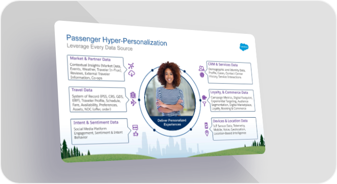 Passenger Hyper-Personalization Leverage Every Data Source Market & Partner Data CRM & Services Data Demographic and Identity Data, Contextual Insights (Market Data, Profile, Cases, Contact Center Events, Weather, Traveler In-Flux), History, Service Interactions Reviews, External Traveler Information, Co-ops Travel Data Loyalty, & Commerce Data System of Record (PSS, CRS, GDS, Campaign Metrics, Digital Footprint, Experiential Targeting, Audience ERP), Traveler Profile, Schedule, Segmentation, Digital Marketplace, Fare, Availability, Preferences, Loyalty, Booking & Commerce Assets, NDC (offer, order) Deliver Personalized Intent & Sentiment Data Devices & Location Data Experiences IoT Sensor Data, Telemetry, Social Media Platform Mobile, Voice, Geolocation, Engagement, Sentiment & Intent Location-Based Intelligence Behavior