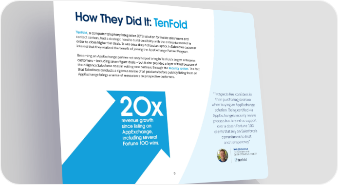 How They Did It: TenFold Tenfold, a computer telephony integration (CTI) solution for inside sales teams and contact centers, had a strategic need to build credibility with the enterprise market in order to close higher tier deals. It was once they noticed an uptick in Salesforce customer interest that they realized the benefit of joining the AppExchange Partner Program. Becoming an AppExchange partner not only helped bring in TenFold’s largest enterprise customers — including seven-figure deals — but it also provided a layer of trust because of the diligence Salesforce does in vetting new partners through the security review. The fact that Salesforce conducts a rigorous review of all products before publicly listing them on AppExchange brings a sense of reassurance to prospective customers. “Prospects feel confident in their purchasing decision when buying an AppExchange 2Ox solution. Being certified via revenue growth AppExchange’s security review since listing on process has helped us support AppExchange, over a dozen Fortune 100 including several clients that rely on Salesforce’s Fortune 1OO wins. commitment to trust and transparency.” DAN SINCAVAGE CO-FOUNDER AND CHIEF OPERATING OFFICER 9