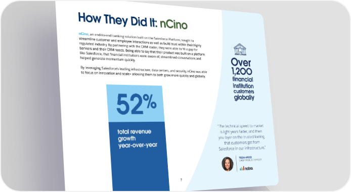 How They Did It: nCino nCino, an end-to-end banking solution built on the Salesforce Platform, sought to streamline customer and employee interactions as well as build trust within their highly regulated industry. By partnering with the CRM leader, they were able to fill a gap for 2Ox bankers and their CRM needs. Being able to say that their product was built on a platform revenue growth since listing on like Salesforce, that financial institutions were aware of, streamlined conversations and AppExchange, including several helped generate momentum quickly. Fortune 1OO wins. By leveraging Salesforce’s leading infrastructure, data centers, and security, nCino was able to focus on innovation and scale– allowing them to both grow more quickly and globally. % 52 total revenue “The technical speed to market growth is light years faster, and then you layer on the trusted feeling year-over-year that customers get from Salesforce in our infrastructure.” TRISHA PRICE CHIEF PRODUCT OFFICER 7 Revenue growth since listing 2Oxon AppExchange including several Fortune100 wins More than 2X AppExchange lead conversion compared to tenfold’s average across other inbound sources