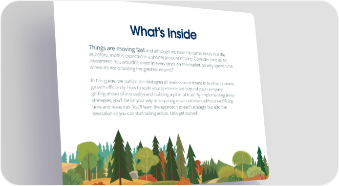 What’s Inside Things are moving fast and although we have the same hours in a day as before, more is expected in a shorter amount of time. Consider time as an investment. You wouldn’t invest in every stock on the market, so why spend time where it’s not providing the greatest returns? In this guide, we outline the strategies all leaders must invest in to drive business growth efficiently: How to scale your go-to-market beyond your company, getting ahead of innovation and building a pillar of trust. By implementing these strategies, you’ll be on your way to acquiring new customers without sacrificing time and resources. You’ll learn the approach to each strategy, but also the execution so you can start taking action. Let’s get started. 2