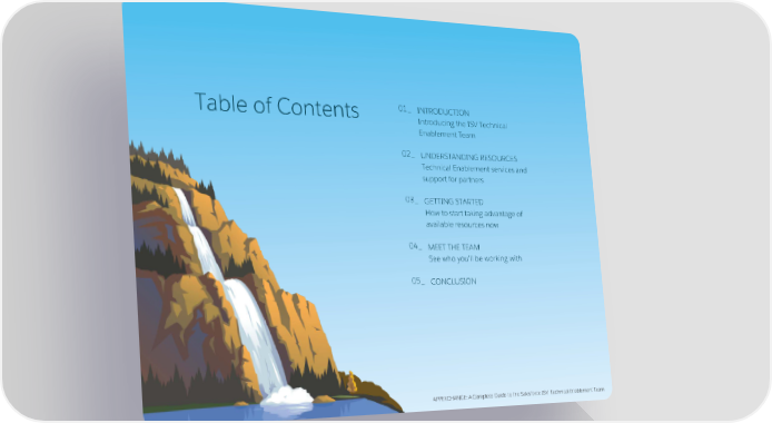 01_ INTRODUCTION Table of Contents Introducing the ISV Technical Enablement Team 02_ UNDERSTANDING RESOURCES Technical Enablement services and support for partners 03_ GETTING STARTED How to start taking advantage of available resources now 04_ MEET THE TEAM See who you'll be working with 05_ CONCLUSION APPEXCHANGE: A Complete Guide to the Salesforce ISV Technical Enablement Team
