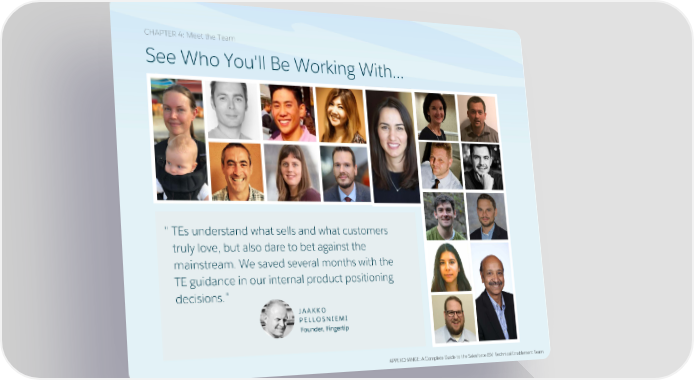 CHAPTER 4: Meet the Team See Who You'll Be Working With... " TEs understand what sells and what customers truly love, but also dare to bet against the mainstream. We saved several months with the TE guidance in our internal product positioning " decisions. JAAKKO PELLOSNIEMI Founder, Fingertip APPEXCHANGE: A Complete Guide to the Salesforce ISV Technical Enablement Team