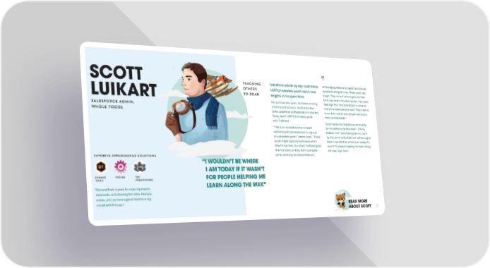17 - SCOTT TEACHING Salesforce admin by day, Scott helps encouraging them to try again and answer OTHERS LGBTQ homeless youth reach new questions along the way. These youth are TO SOAR heights in his spare time. tough . They do not have to give me their LUIKART ti me, but when they see success, they want For just over two years, he's been running that high five. This connection is what so SALESFORCE ADMIN , #MGPdoesTrailhea.rt. Scott and a few many homeless people need. They need to WHOLE FOODS other Salesforce professionals in Houston, know they matter and people care about Texas, teach LGBTQ homeless youth them as individuals ." with Trailhead. Scott thanks the Salesforce commun ity "This is an incredible time to teach for his ability to do this work . "I firmly resilience and perseverance to a group believe that I have been given so much of vulnerable youth," shares Scott. "These by this community that I am called to give youth might typically walk away when back. I would n't be where I am today if it they hit barriers, but when Trailhead gives wasn't for people helping me learn along them an error, or they don't comp lete the way," says Scott. FAVORITE APPE XC HANGE SOLUT IONS a tr ial correct ly, we cheer them on, ffl "I WOULDN'T BE WHERE I AM TODAY IF T WASN'T DEMAND PROVAR THE FOR PEOPLE HE PING ME TOOLS PERMISSION ER "DemandTools is great for reducing reports, LEARN ALONG data loads, and cleaning that data. Dedupe, delete, and just have a great Salesforce org overall with this app." READ MORE ABOUT SCOTT >