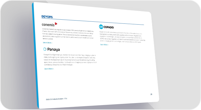 devops conemis is Salesforce migration, automated. With pre-built paths from Salesforce, Copado is the #1 native devops platform for Salesforce. We enable faster, error- Oracle, Microsoft, SAP and more to Salesforce, conemis removes risks and delays free digital cloud deployments and upgrades with continuous integration and from any Salesforce migration. The collaborative cloud tool accelerates source deployment technologies, all via an enterprise-class developer platform that is assessment, data migration, consolidation, and overall project timelines for a fast 100% native, fully integrated with Salesforce DX and Salesforce Clouds. The DevOps lane to success. world is changing at the speed of light, make sure you keep up with Copado. Learn More > Learn More > Panaya’s ForeSight helps you foresee the impact and risk of any change you plan to make, before going live in production. You can run an impact analysis in real time, based on the dependencies of the components in your Salesforce org, including: apex classes, process builders, fields and more. Imagine your next deployment with confidence, minus the risk. That’s ForeSight. Learn More > EMEA ISV Industry Booklet — TTH 20