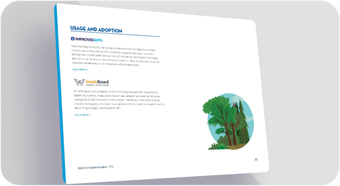 usage and adoption Improved Apps is the only native digital enablement tool for Salesforce. It helps improve user productivity and knowledge by engaging employees, customers and partners in their preferred way. Now, all the training, learning and knowledge absorption can be done in-situ, at the user’s point of need, on any device. A typical customer will see a return on investment within three months. Learn More > InsideBoard is the first digital platform for change management integrated into Salesforce, to boost, measure and sustain user adoption and team performance. Leveraging AI and the power of communities, InsideBoard is the most complete solution for engaging employees in a seamless, self-service and personalised manner and driving company transformation ROI. Learn More > EMEA ISV Industry Booklet — TTH 22