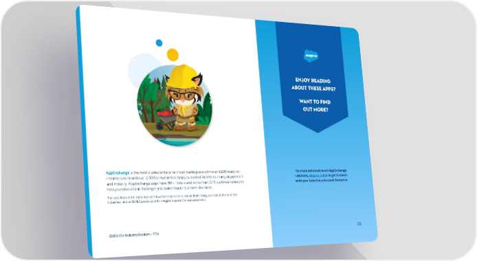 EEnnjojoyy r reeaaddinging aabbooutut t thheessee a apppsps?? WWaannt tt to fo fiinndd ooutut m moorree?? AppExchange is the most trusted enterprise cloud marketplace with over 4,600 ready-to- ForFor m mororee in infforormmaattiionon on on A AppppEExxcchhaannggee install solutions and over 2,000 consultants to help you extend Salesforce in any department ssooluluttioionnss,, ddrroop up us a ls a liinnee o or gr geet it in tn toouucchh and industry. AppExchange apps have 9M+ installs and more than 117K customer reviews to wwiitth yh yoouur Sr Saalleessffoorrcce Ae Accccoouunnt Et Exxeeccuuttiivvee help you solve critical challenges and make smarter business decisions. The apps featured in these booklets have been selected based on their strong use cases in the selected industries, and an EMEA presence with in-region support for our customers. EMEA ISV Industry Booklet — TTH 2233