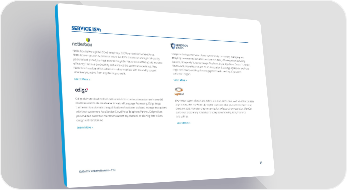 service ISVS Natterbox delivers global cloud telephony, 100% embedded in Salesforce. Complete the true 360° view of your customers by connecting, managing, and Natterbox empowers businesses to use live CRM data to deliver high call quality, analysing customer reviews and questions with nearly 50 integrations including: personalised phone journeys around the globe. Natterbox enables you to increase Amazon, Google My Business, Google Play Store, Apple App Store, Ocado, Trustpilot, efficiency, improve productivity and enhance the customer experience. Plus, Bazaarvoice, PowerReviews and Yotpo. Reputation Studio aggregates reviews into a Natterbox Freedom offers a transformative interface with the ability to work single dashboard, enabling direct engagement and unlocking AI-powered wherever you want, from any device you want. customer insights. Learn More > Learn More > Odigo delivers cloud contact centre solutions to enterprise customers in over 80 Live video support with AR and AI for customers, technicians, and providers. Escalate countries worldwide. As a leader in Natural Language Processing, Odigo helps any conversation to a video call, so your team sees what your customer, technician, businesses to automate the qualification of customer calls and manage interactions or patient sees. Remotely diagnose and guide to fast problem resolution. SightCall with their customers. As a Service Cloud Voice Telephony Partner, Odigo drives customers cross many industries including manufacturing, telco, insurance personalised customer interactions across any channel, combining data-driven and utilities. design with Einstein AI. Learn More > Learn More > EMEA ISV Industry Booklet — TTH 14