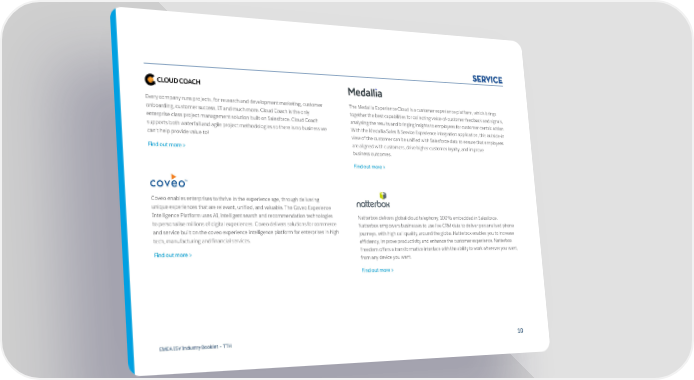 Service Every company runs projects, for research and development marketing, customer The Medallia Experience Cloud is a customer experience platform, which brings onboarding, customer success, IT and much more. Cloud Coach is the only together the best capabilities for collecting voice-of-customer feedback and signals, enterprise class project management solution built on Salesforce. Cloud Coach analysing the results and bringing insights to employees for customer-centric action. supports both waterfall and agile project methodologies so there is no business we With the Medallia Sales & Service Experience integration application, this outside-in can’t help provide value to! view of the customer can be unified with Salesforce data to ensure that employees are aligned with customers, drive higher customer loyalty, and improve Find out more > business outcomes. Find out more > Coveo enables enterprises to thrive in the experience age, through delivering unique experiences that are relevant, unified, and valuable. The Coveo Experience Intelligence Platform uses AI, intelligent search and recommendation technologies Natterbox delivers global cloud telephony, 100% embedded in Salesforce. to personalise millions of digital experiences. Coveo delivers solutions for commerce Natterbox empowers businesses to use live CRM data to deliver personalised phone and service built on the coveo experience intelligence platform for enterprises in high journeys, with high call quality, around the globe. Natterbox enables you to increase tech, manufacturing and financial services. efficiency, improve productivity and enhance the customer experience. Natterbox Find out more > Freedom offers a transformative interface with the ability to work wherever you want, from any device you want. Find out more > EMEA ISV Industry Booklet – TTH 1010