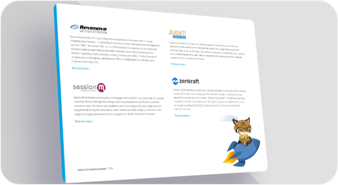 Revenova provides third-party logistics companies and shippers with in-house Sugati is an end-to-end solution natively designed on Salesforce.com for tour shipping departments — a native force.com multi-modal transportation management operators, travel agents and institutes that specialise in organising luxury and system (TMS) - Revenova TMS. It is a CRM-powered transportation management business trips or group holidays. Our clients use Sugati to handle enquiries, organise solution enabling seamless collaboration between customers, carriers and co- tours, create beautiful quotes, take online payments, produce invoices, manage workers regarding freight planning, pricing, tracking and billing. Today, thousands supplier & client relations effectively. of users around the globe use Revenova TMS on a daily basis for domestic and international shipments. Find out more > Find out more > Nearly 1,000 Salesforce customers use Zenkraft daily to track shipments, process returns and fulfil orders natively on the Salesforce platform. Without leaving SessionM is Mastercard’s loyalty and engagement platform, purpose-built to increase Salesforce, service reps can answer “Where is my order?” enquiries and process customer loyalty through delivering superior personalised experiences rooted in returns in seconds not minutes with 60+ global carriers. Zenkraft works across customer data. We deliver personalised, real-time engagement and loyalty at scale all clouds including B2B & B2C Commerce, Service, CPQ and every other by gathering first-party data about users’ behaviours and using our real-time rules Salesforce Cloud. engine to trigger personalised user engagement at the moments of impact. Find out more > Find out more > EMEA ISV Industry Booklet – TTH