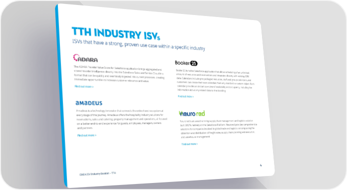 TTH Industry ISVs ISVs that have a strong, proven use case within a specific industry The ADARA Traveler Value Score for Salesforce application brings aggregated and Booker25 is native Salesforce application that allows scheduling of an unlimited scored traveler intelligence directly into the Salesforce Sales and Service Cloud in a amount of resources and reservations and integrates directly with existing CRM format that can be quickly and seamlessly ingested into current processes, creating data. Calendars include pre-packaged resources, staff and groups calendars, and immediate opportunities to increase customer relevance and value. customers can create their own calendars from any standard or custom object. Each calendar provides an instant overview of availability and occupancy, including the Find out more > information about any related data to that booking. Find out more > Amadeus is a technology innovator that connects the entire travel ecosystem at every stage of the journey. Amadeus offers the hospitality industry solutions for reservations, sales and catering, property management and operations, all focused on a better end-to-end experience for guests, employees, managers, owners Neurored is an award-winning supply chain management and logistics solution and partners. built 100% natively on the Salesforce Platform. Neurored provides comprehensive solutions for companies involved in global trade and logistics encompassing the Find out more > obtention and distribution of freight rates, supply chain planning and execution, and warehouse management. Find out more > EMEA ISV Industry Booklet – TTH 44