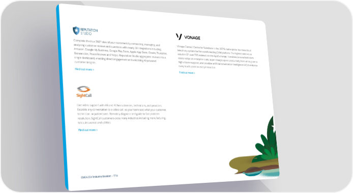 Complete the true 360° view of your customers by connecting, managing, and Vonage Contact Centre for Salesforce is the 100% native global business cloud analysing customer reviews and questions with nearly 50 integrations including: telephony system for the world’s leading CRM platform. The highest rated voice Amazon, Google My Business, Google Play Store, Apple App Store, Ocado, Trustpilot, solution (5* over 736 reviews) on the AppExchange, it enables personalised client Bazaarvoice, PowerReviews and Yotpo. Reputation Studio aggregates reviews into a relationships at enterprise scale, super-charges agent productivity from white glove to single dashboard, enabling direct engagement and unlocking AI-powered high volume support, and provides artificial conversation intelligence (AI) to enhance customer insights. every touch point on every interaction. Find out more > Find out more > Live video support with AR and AI for customers, technicians, and providers. Escalate any conversation to a video call, so your team sees what your customer, technician, or patient sees. Remotely diagnose and guide to fast problem resolution. SightCall customers cross many industries including manufacturing, telco, insurance and utilities. Find out more > EMEA ISV Industry Booklet – TTH