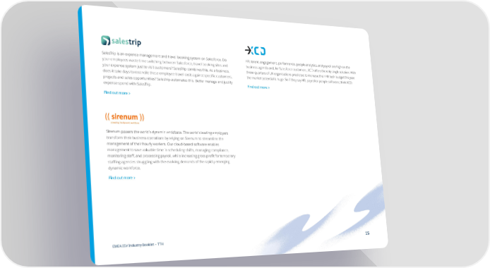 SalesTrip is an expense management and travel booking system on Salesforce. Do HR, talent, engagement, performance, people analytics, and payroll are high on the your employees waste time switching between Salesforce, travel booking sites and business agenda and, for Salesforce customers, XCD offers the only single solution. With your expense system just to visit customers? SalesTrip combines this. As a business, three-quarters of UK organisations predicted to increase their HR tech budget this year, does it take days to reconcile these employee travel costs against specific customers, the market potential is huge. So if they say HR, payroll or people software, think XCD. projects and sales opportunities? SalesTrip automates this. Better manage and justify expense spend with SalesTrip. Find out more > Find out more > Sirenum powers the world’s dynamic workforce. The world’s leading employers transform their business operations by relying on Sirenum to streamline the management of their hourly workers. Our cloud-based software enables management to save valuable time in scheduling shifts, managing compliance, monitoring staff, and processing payroll, while increasing gross profit for temporary staffing agencies struggling with the evolving demands of the rapidly emerging dynamic workforce. Find out more > EMEA ISV Industry Booklet – TTH 15
