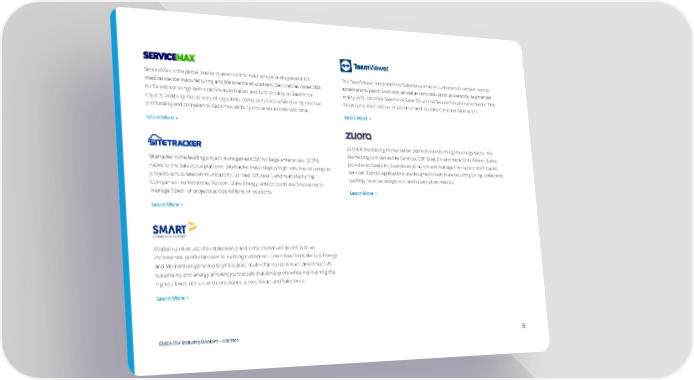 ServiceMax is the global leader in asset-centric field service management for The TeamViewer integration for Salesforce enables customers to embed remote medical device manufacturing and life science equipment. ServiceMax Asset 360 access and support functions, as well as remote support powered by augmented for Salesforce brings best-practice automation and functionality to Salesforce reality (AR), into their Salesforce Sales Cloud and Service Cloud environments. This objects, enabling the delivery of regulated, complex service while driving revenue, helps customers resolve issues faster and increase customer satisfaction. profitability and compliance. Gain new visibility into asset and service data. Learn More > Learn More > Zuora is the leading monetisation platform transforming the energy sector. We are helping companies like Centrica, EDF, Enel, Eni and more to transform. Zuora Sitetracker is the leading project management ISV for large enterprises. 100% provides software for businesses to launch and manage their subscription-based native to the Salesforce platform, Sitetracker helps deploy high volumes of complex services. Zuora’s applications are designed to automate recurring billing, collections, projects across telecommunications, utilities, IoT, retail, and manufacturing. quoting, revenue recognition, and subscription metrics. Companies like Vodafone, Verizon, Duke Energy, and Ericsson use Sitetracker to manage $24B+ of projects across millions of locations. Learn More > Learn More > Modern utilities use their statements and other communications to drive incremental, profitable sales to existing customers. Learn how firms like Just Energy and Momentum generate sophisticated, multi-channel communications such as statements and energy efficiency proposals that drive profit while maintaining the highest levels of trust and compliance across Smart and Salesforce. Learn More > EMEA ISV Industry Booklet — Utilities 5