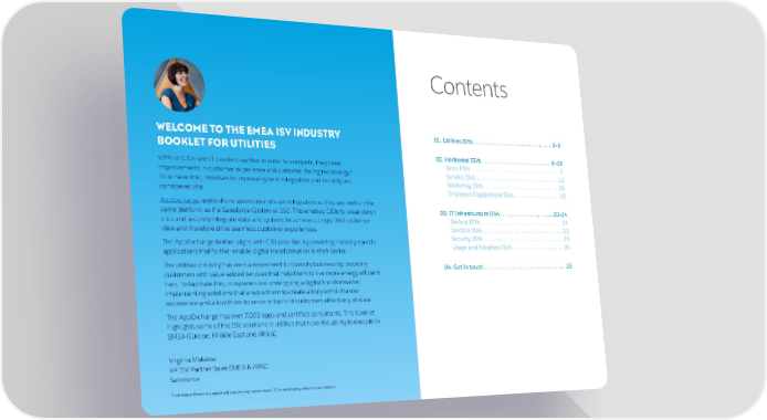Contents WELCOME TO THE EMEA ISV INDUSTRY 01. Utilities ISVs . . . . . . . . . . . . . . . . . . . . . . . . . . . . . . . 3–5 BOOKLET FOR UTILITIES 02. Horizontal ISVs . . . . . . . . . . . . . . . . . . . . . . . . . . . 6–19 93% of CIOs and IT Leaders say that in order to compete, they need Sales ISVs . . . . . . . . . . . . . . . . . . . . . . . . . . . . . . . . . . . .7 improvements in customer experience and customer facing technology.* Service ISVs . . . . . . . . . . . . . . . . . . . . . . . . . . . . . . . . 12 To achieve this, initiatives to improve system integration and security are Marketing ISVs . . . . . . . . . . . . . . . . . . . . . . . . . . . . . .16 considered vital. Employee Engagement ISVs . . . . . . . . . . . . . . . . . . 18 AppExchange applications speed up and ease integration as they are built on the same platform as the Salesforce Customer 360. This enables CIOs to break down 03. IT Infrastructure ISVs . . . . . . . . . . . . . . . . . . . . . 20–24 silos and securely integrate data and systems to achieve a single 360 customer Backup ISVs . . . . . . . . . . . . . . . . . . . . . . . . . . . . . . . . 21 view and therefore drive seamless customer experiences. DevOps ISVs . . . . . . . . . . . . . . . . . . . . . . . . . . . . . . . . 22 The AppExchange further aligns with CIO priorities by providing industry-specific Security ISVs . . . . . . . . . . . . . . . . . . . . . . . . . . . . . . . 23 applications that further enable digital transformation in their sector. Usage and Adoption ISVs . . . . . . . . . . . . . . . . . . . . 24 The utilities industry has seen a movement to diversify business by providing 04. Get in touch . . . . . . . . . . . . . . . . . . . . . . . . . . . . . . . . 25 customers with value-added services that help them to live more energy efficient lives. To facilitate this, companies are undergoing a digital transformation, implementing solutions that enable them to create a truly omni-channel experience and allow them to serve millions of customers effectively at scale. The AppExchange has over 7,000 apps and certified consultants. This booklet highlights some of the ISV solutions in utilities that have the ability to execute in EMEA (Europe, Middle East and Africa). Virginia Matassa VP ISV Partner Sales EMEA & APAC Salesforce *Salesforce Research analysed survey responses from 100+ technology leaders worldwide