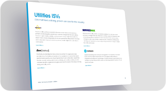 Utilities ISVs ISVs that have a strong, proven use case for the industry Aptumo is billing software created for the water sector. Native to the Salesforce With ServiceMax, utility workers are digitally-enabled with the right information platform and developed by specialists in customer management for water utilities, and tools to manage their work, their assets, and their customers. Integrations with Aptumo is agile, flexible, scalable, and futureproof. Using a single data model that critical utility applications optimize the execution of both short-cycle operations doesn’t need complex integrations, it’s the next-generation billing solution that helps - emergency work, meter services, compliance jobs, maintenance and inspection water companies improve customer experience, enables digitization, and reduces - and long-cycle operations such as outage management that encompass multiple cost-to-serve. days, tasks, and people. Learn More > Learn More > OwnBackup is a leading SaaS data protection platform for organizations that Copado is a leading native DevOps & Testing platform for Salesforce. We enable use Salesforce. OwnBackup empowers utility organizations to realize their digital faster, error-free digital cloud deployments and upgrades with continuous transformation goals by securing and protecting mission-critical data. Capabilities integration and deployment technologies. All this is delivered via an enterprise-class like data security, backup and recovery, archiving, and sandbox seeding provides developer platform that is 100% native and fully integrated with Salesforce DX and solutions that allow organizations to grow and meet the needs of the always-evolving Salesforce Clouds. energy and utility sector. Learn More > Learn More > APAC ISV Industry Booklet — Utilities 4