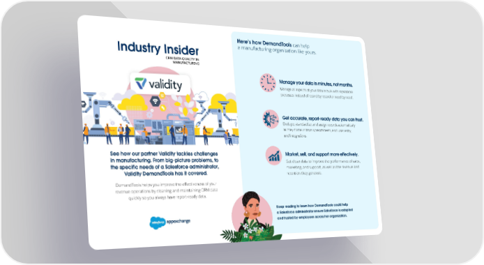 Here’s how DemandTools can help Industry Insider a manufacturing organization like yours. CRM DATA QUALITY IN MANUFACTURING Manage your data in minutes, not months. Manage all aspects of your data in bulk with repeatable processes instead of record by record or need by need. Get accurate, report-ready data you can trust. Dedupe, standardize, and assign records automatically as they come in from spreadsheets, end-user entry, and integrations. See how our partner Validity tackles challenges Market, sell, and support more effectively. in manufacturing. From big-picture problems, to Get clean data to improve the performance of sales, the specific needs of a Salesforce administrator, marketing, and support, as well as the revenue and Validity DemandTools has it covered. retention they generate. DemandTools helps you improve the effectiveness of your revenue operations by cleaning and maintaining CRM data quickly so you always have report-ready data. Keep reading to learn how DemandTools could help a Salesforce administrator ensure Salesforce is adopted and trusted by employees across her organization.