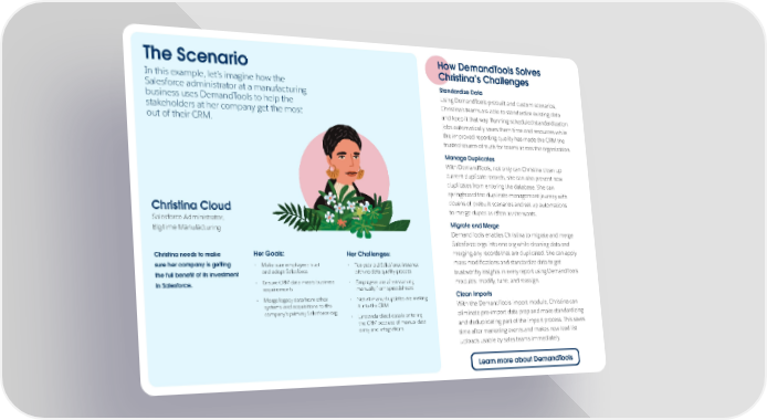 How DemandTools Solves The Scenario Christina’s Challenges In this example, let’s imagine how the Standardize Data Salesforce administrator at a manufacturing Using DemandTools prebuilt and custom scenarios, business uses DemandTools to help the Christina’s teams are able to standardize existing data stakeholders at her company get the most and keep it that way. Running scheduled standardization out of their CRM. jobs automatically saves them time and resources while the improved reporting quality has made the CRM the trusted source of truth for teams across the organization. Manage Duplicates With DemandTools, not only can Christina clean up current duplicate records, she can also prevent new duplicates from entering the database. She can springboard the duplicate management journey with Christina Cloud dozens of prebuilt scenarios and set up automations to merge dupes as often as she wants. Salesforce Administrator, Migrate and Merge BigTime Manufacturing DemandTools enables Christina to migrate and merge Salesforce orgs into one org while cleaning data and Christina needs to make Her Goals: Her Challenges: merging any records that are duplicated. She can apply sure her company is getting • Make sure employees trust • Ten-year-old Salesforce instance mass modifications and standardize data to get the full benefit of its investment and adopt Salesforce with no data quality process trustworthy insights in every report using DemandTools in Salesforce. • Ensure CRM data meets business • Employees are often working modules: modify, tune, and reassign. requirements manually from spreadsheets • Merge legacy data from other • Not all manual updates are making Clean Imports systems and acquisitions to the it into the CRM With the DemandTools import module, Christina can company’s primary Salesforce org • Unstandardized data is entering eliminate pre-import data prep and make standardizing the CRM because of manual data and deduplicating part of the import process. This saves entry and integrations time after marketing events and makes new lead list uploads usable by sales teams immediately. Learn more about DemandTools